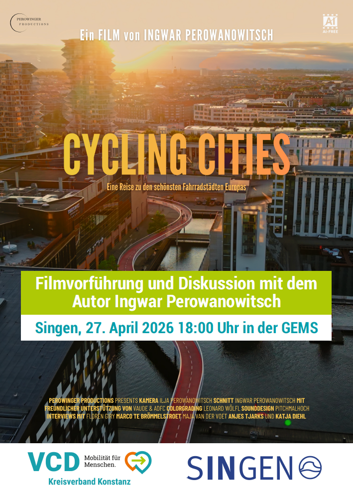 Der Verkehrsclub Deutschland Kreisverband Konstanz und die Stadt Singen laden ein zur Filmvorführung des Dokumentarfilms CYCLING CITIES mit anschließender Diskussion in Anwesenheit des Filmemachers Ingwar Perowanowitsch in Singen am 27. April 2026 18:00 Uhr in der GEMS.