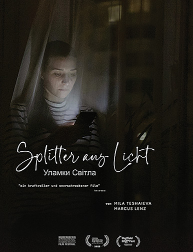 (Уламки Світла) Deutschland / Ukraine /GB/DK/SWE 2022-25 | dokumentarische Form | Regie: Mila Teshaieva / Marcus Lenz | Kamera: Marcus Lenz | Schnitt: Agata Cierniak | Musik: Carl Ludwig Wetzig | Produktion: M. Lenz/Patrick Waldmann/Mila Teshaieva/Mathilde Kirstein | Mitwirkende: Olga Malakh, Taras Vyazovchenko, Liudmyla Kizilova, Anna Tarasiuk, Maxim Lisnytskyi, Olena Tymkova, Yuri Bilous, Alla u. Valeriy Nachyporenko, u.a.| DCP | Farbe | DD 5.1 | OmdU (Ukrainisch / dtsch. UT) | ‚FSK-Deskriptoren: Gewalt, Bedrohung, belastende Themen’ | FSK: ab 12 J. | 93 Min.